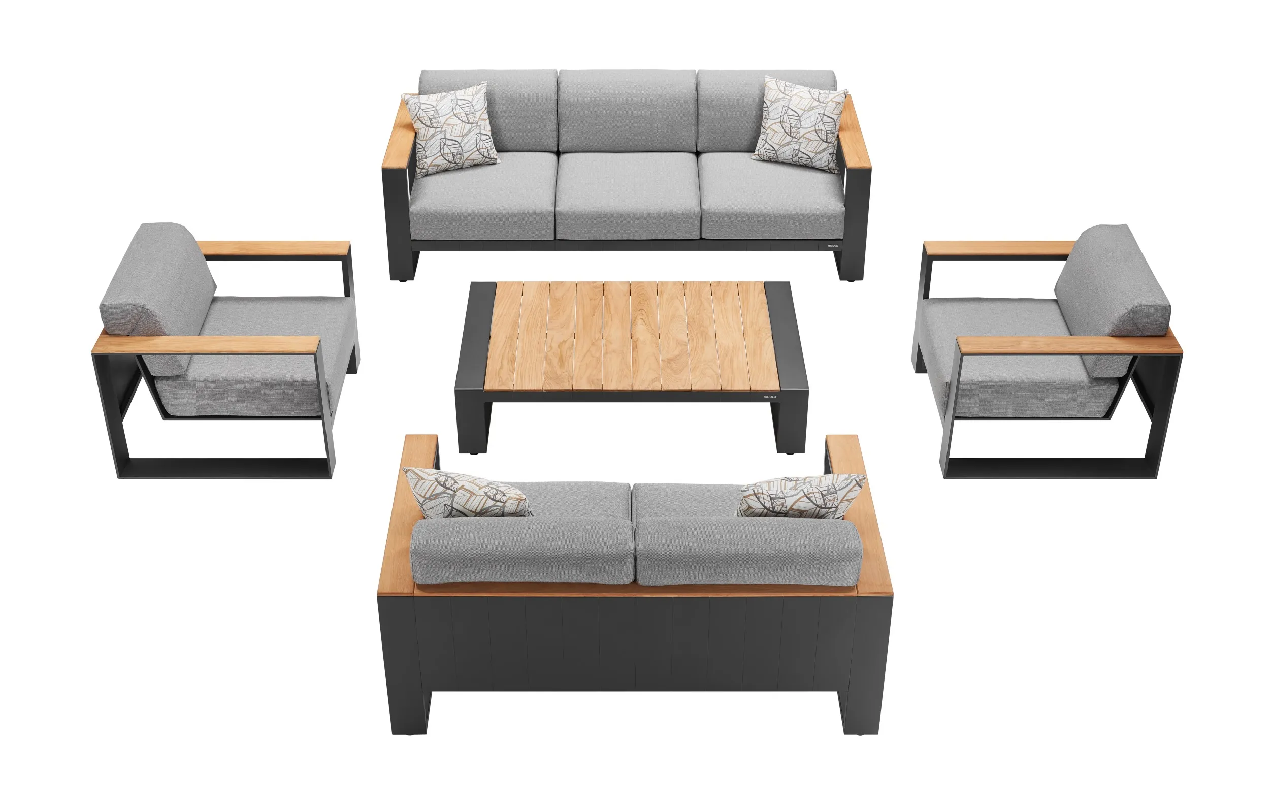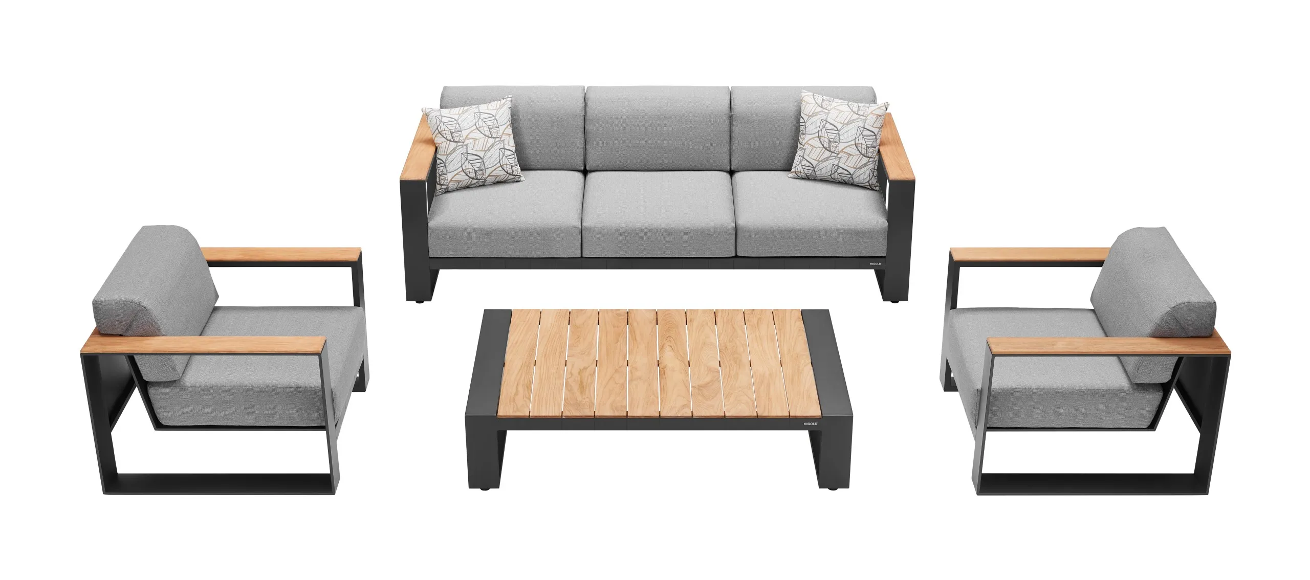 Lightweight, sturdy, scratch-resistant, and low-maintenance aluminium frame with dirt-repellent, UV-resistant, and wear-resistant cushions and teak elements.
