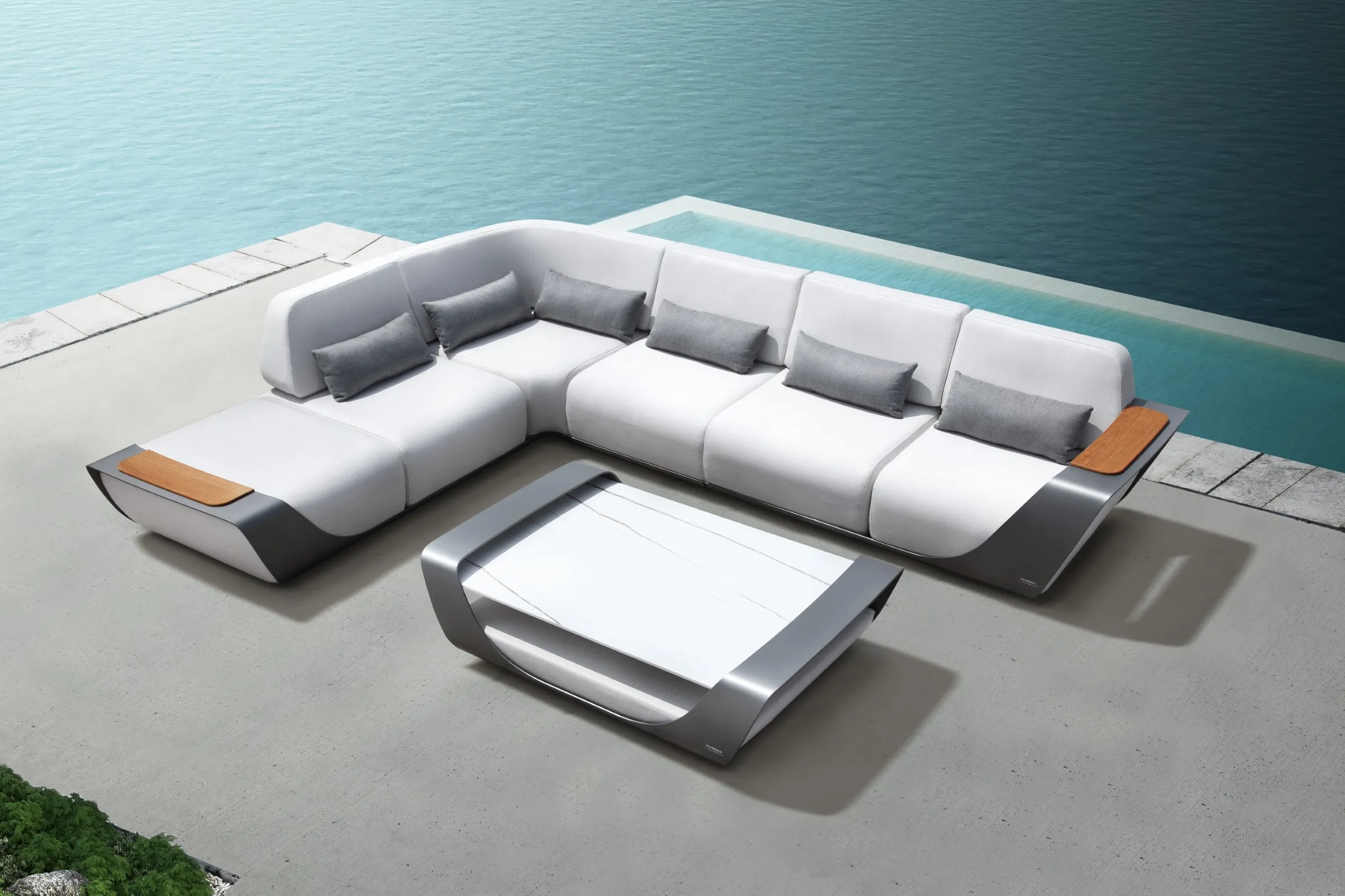 The ONDA Luxury Corner Sofa White combines automotive-grade aluminium, yacht-quality marine fabrics and elegant natural teak to deliver a premium outdoor lounge experience. Featuring a high backrest, generous seating and a matching coffee table, this sculptural Pininfarina-designed corner sofa brings modern coastal luxury and long-lasting performance to any outdoor space.