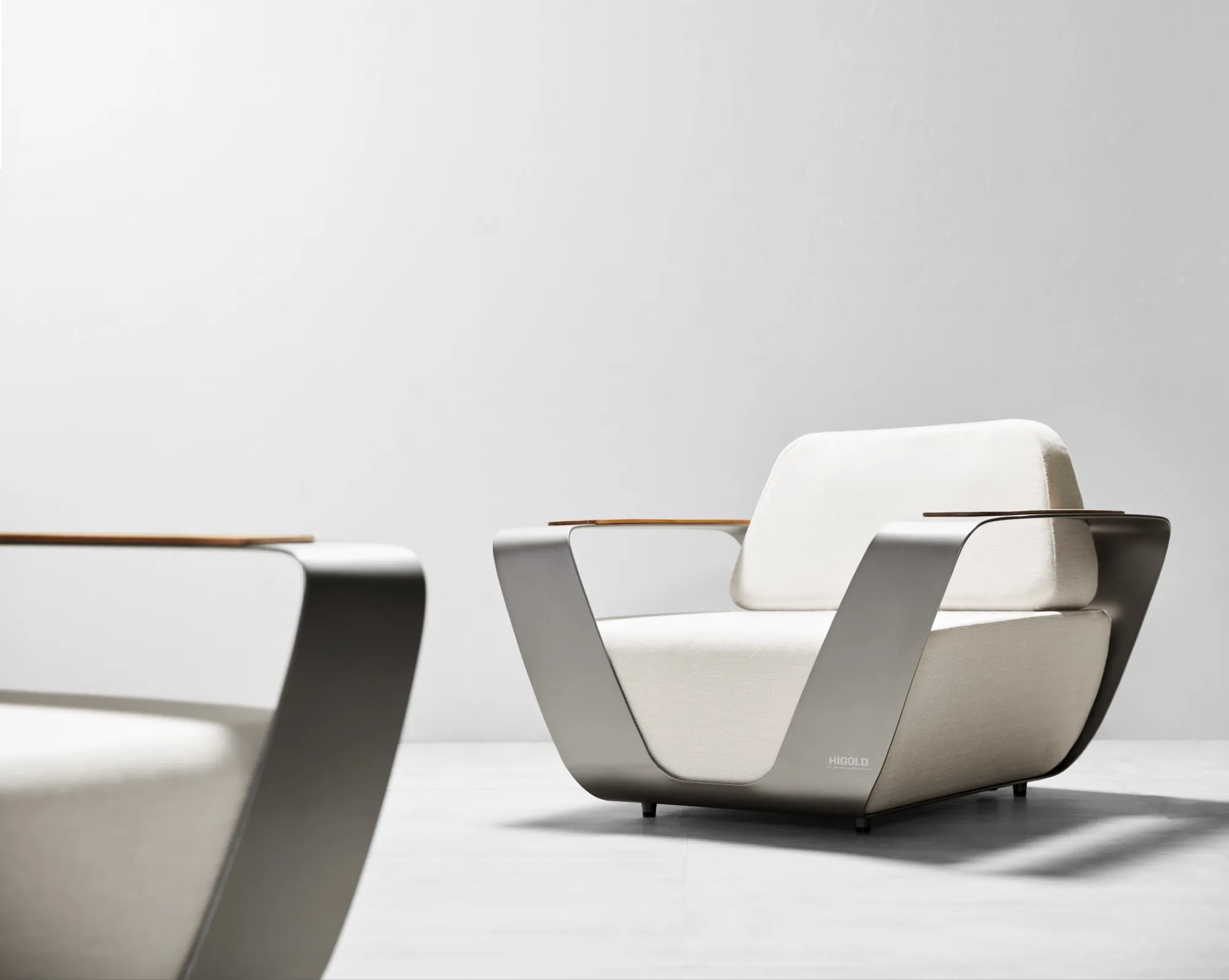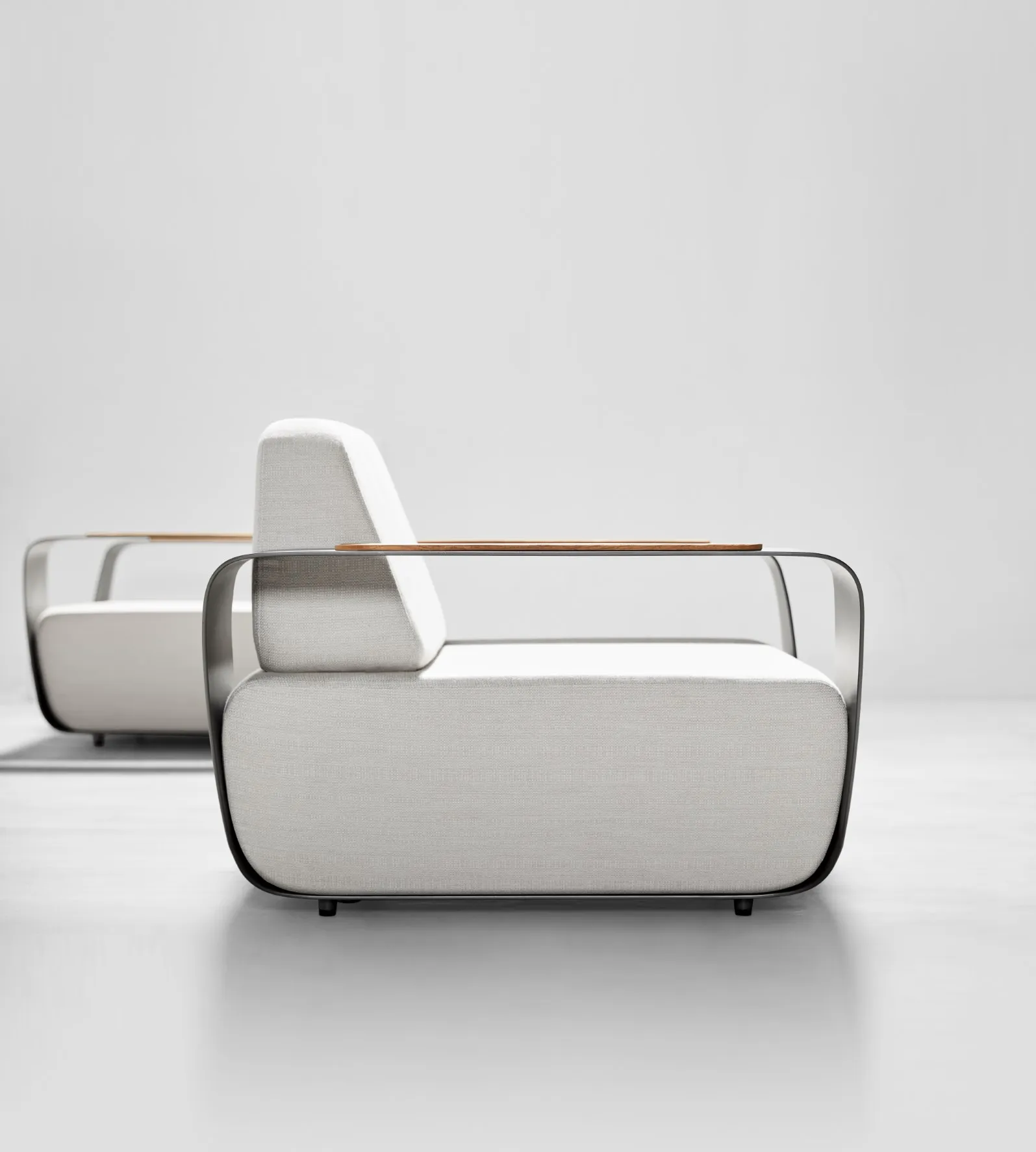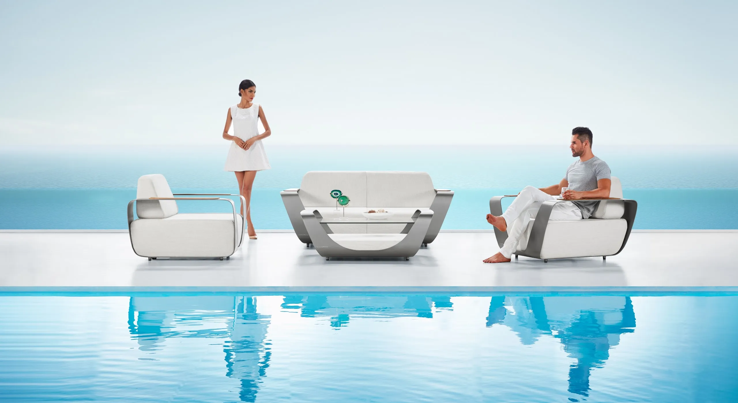 ONDA outdoor sofa set. Conceived for the outdoor furniture, the Pininfarina design team took the inspiration from the dynamism, elegance and purity of the ocean waves, the empty space that is created when a wave is broken, resulting in to a hollow or tube wave (Onda in Italian). The heart of the collection is the structure, an aluminum band sustaining the cushions and becoming the iconic element of the whole Collection.
