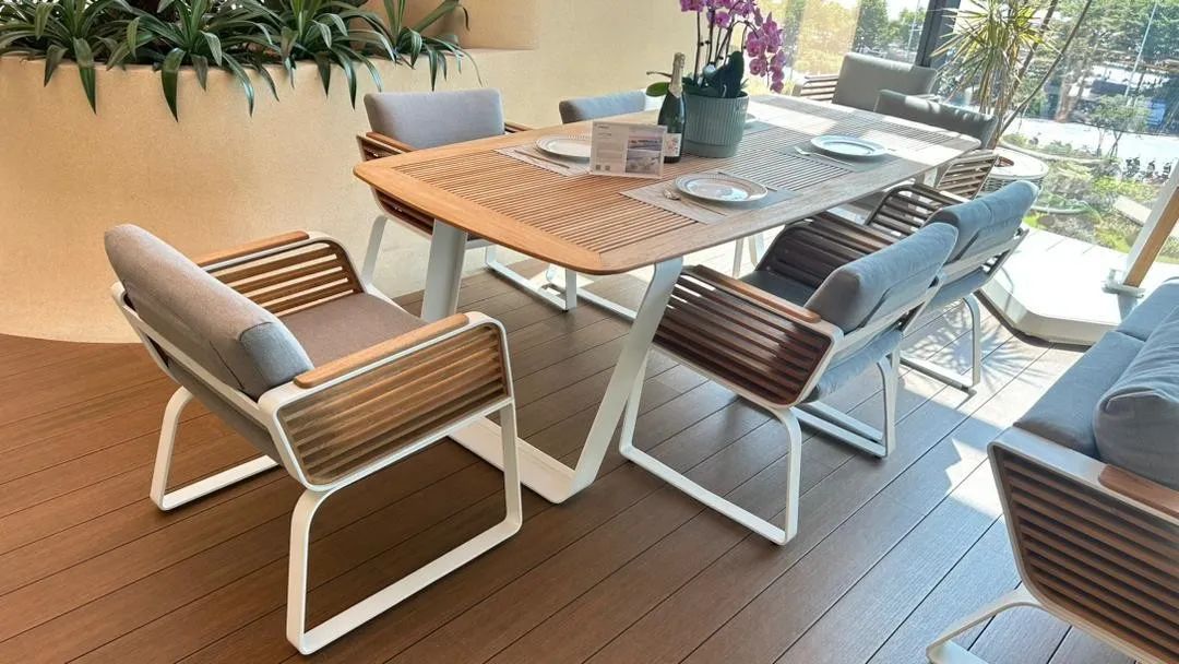 The dining surfaces are enhanced with imported natural teak elements that introduce warmth and organic texture to the geometric structure. The teak detailing softens the architectural form while reinforcing the premium material palette. Designed to age gracefully, the teak maintains its integrity in outdoor environments, adding timeless sophistication to the set.