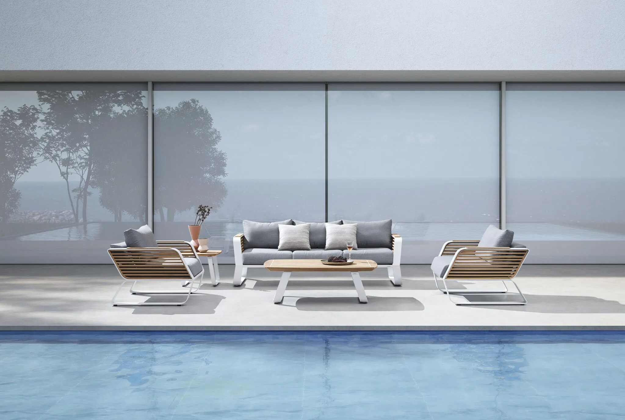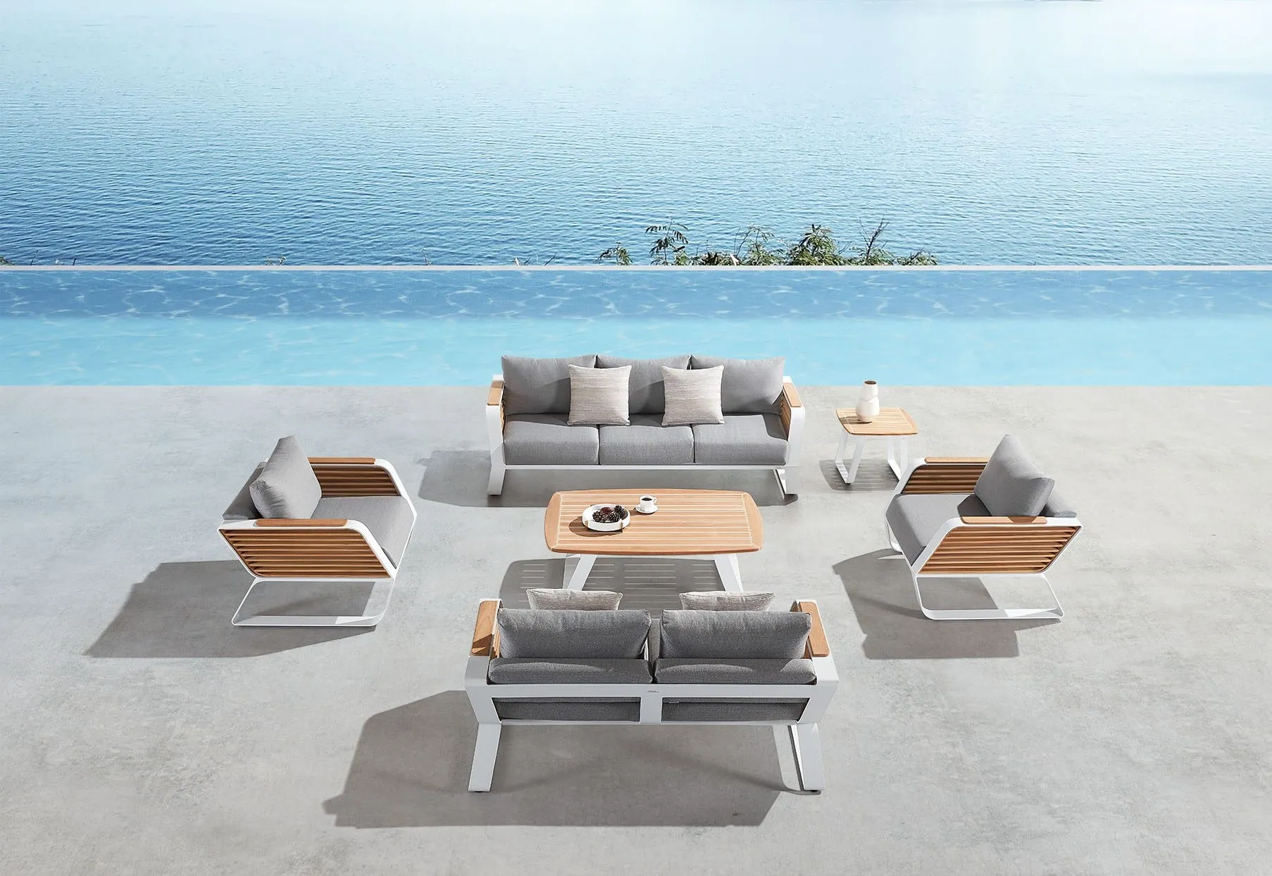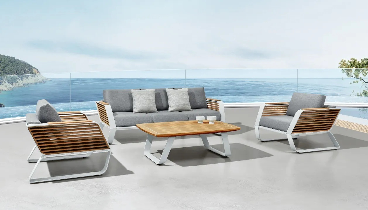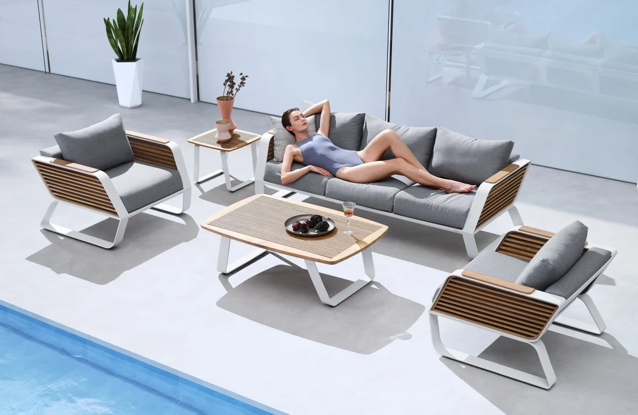 Experience the refined texture of teak louver panels, where dynamic lines embrace the light. Indulge in luxury with yacht-grade silicone and imported natural teak for timeless durability. Solid aerospace aluminum ensures strength and enduring quality. Enjoy ultimate comfort with high-density cushions, featuring zero-pressure feather cotton for a gentle touch.