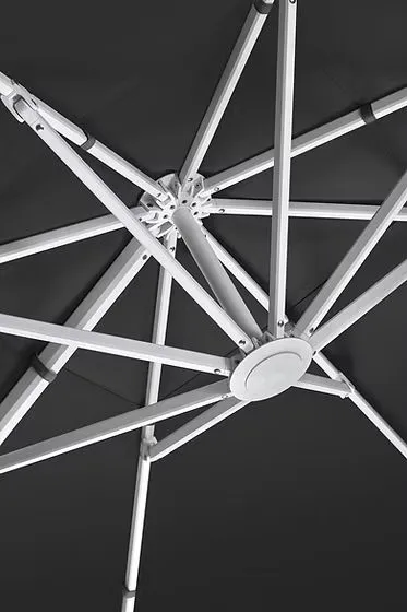 With professional sunshade fabric brand-Sunbrella and water repellent lotus leaf design, no reverse seepage in downpour. High color fastness, no fear of strong ultraviolet light, and it is still fresh in the sun and rain. Heavy construction,visible tenacity. Integrated giga casting of aluminum alloy improves the structural strength, high standards and firmness and the service life is reliably guaranteed. Firm and stable as a rock. Die cast aluminum support column middle pillar, without fear of sudden wind. Resistance to level 6 strong wind, withstand wind of 13.8m/s. Double layer 8-strand umbrella tray, more firm with a patent design. Coarse aluminum alloy umbrella bone. Easy to disassemble and maintain. 360 rotation with foot adjustment easy and labor-saving. No need to bend down, just adjust with your foot. Easy to operate for one person, don’t bother to move the furniture.